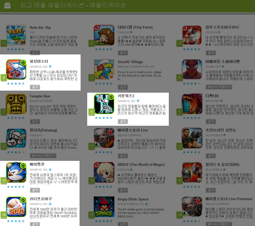 ... 빠른 성장세에 힘입어 모바일게임 관련 주식이 강세를 보이기도 했다. ◆안드로이드 중심 '약진' 글로벌 모바일게임 시장에서는 애플 앱스토어(iOS) 규모가 여타 안드로이드 오픈마켓보다 큰 것으로 알려져 있다. 실제 오픈마켓 리서치 사이트 AppAnnie가 2012년 1월