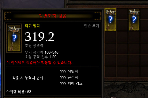 ... 이 옵션번호가 4개의 경우 4가지 옵션이 붙고, 5개의 번호일 경우 5개 옵션이 달린다. 실제 실험 결과 4가지 옵션번호가 달린 무기에서 신성무기 공격력, 힘, 지능, 적중시 생명력 등 4가지 옵션이 붙은 것으로 확인됐다. 문제는 이 같은 옵션 갯수 확인으로 게임 내 시스