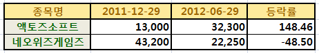 ... 특히 액토즈소프트는 국내 시장에서 신작 등 특별한 이슈 등이 없는 상황에서의 이같은 오름세로 눈길을 끌었다. 반면 네오위즈게임즈의 2월 년간 실적 발표 이후 하염없이 추락하며 지난해 말 4만원대의 주가가 6월 29일 2만2250원에 마감되며 가장 큰 하락세를 나타냈다
