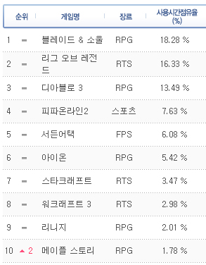 ... 게임전문 리서치 게임트릭스에 따르면 지난 5일 PC방 순위에서 디아블로3는 점유율 13. 48%로 3위에 올랐다. 4일까지 3위였던 리그오브레전드가 16
