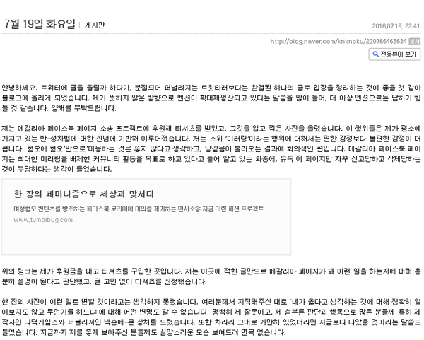 ... 이 소식을 접한 누리꾼은 부당한 계약 해지라며 반발의 표현으로 보이콧을 선언하기도 했다. 김자연 성우는 자신의 블로그를 통해 "메갈리아 페이스북 페이지 소송 프로젝트에 후원해 티셔츠를 받았고, 반-성차별에 대한 신념에 기반해 이뤄졌다"며, "명백히 제 잘못이고, 제 섣부른 판단과