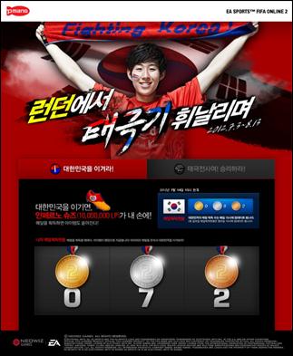 ... 회사 측에 따르면 내달 13일까지 '피파온라인2'에 접속하면 매일 1개의 은메달을, 게임을 플레이하면 경기당 1개의 동메달을 지급된다. 같은 색의 메달을 10개 모으면, 한 단계 위의 메달로 교환할 수 있다. 이벤트가 종료된 이후, 실제 대한민국 성적보다 많은 수의