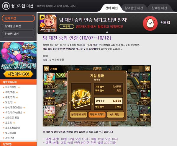 ... 본 이벤트는 10월 12일까지 진행되며 자세한 내용은 '몬스터길들이기 헝그리앱' 커뮤니티 이벤트 공지와 헝그리앱 미션 공지를 통해 확인할 수 있다. 자료 출처 :헝그리앱(http://www. hungryapp