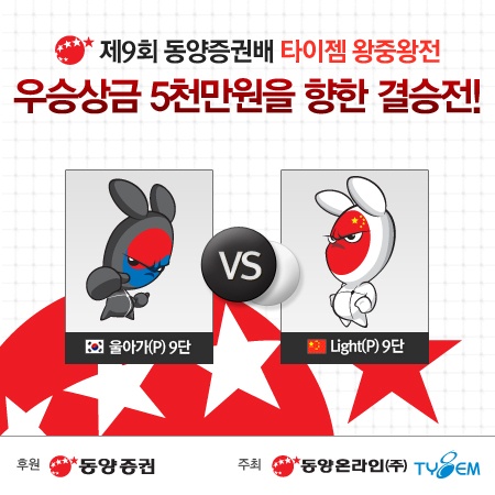 ... '제9회 동양증권배'는 국내를 비롯해 일본, 중국, 대만 등에서 총 396명의 바둑 고수들이 참가한 글로벌 온라인 바둑대회. 이번 결승전은 한국의 울아가(P)와 중국의 Light(P)의 국가간 대결로 결승의 긴장감을 더욱 높이고 있다. 경기는 25일, 26일, 27일