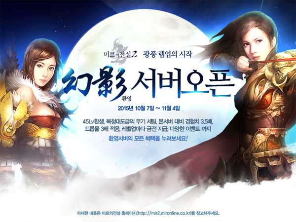 ... 이번에 공개된 환영 서버는 광속레벨업이 가능한 이벤트 서버로 오는 7일부터 11월 4일까지 모든 유저가 접속할 수 있다. 환영 서버로 이전하는 캐릭터는 기존 레벨에 관계없이 모두 45레벨로 자동 적용되며, 레벨에 맞는 무공 및 장비를 지급해 더욱 박진감 넘치는 플레이를 즐