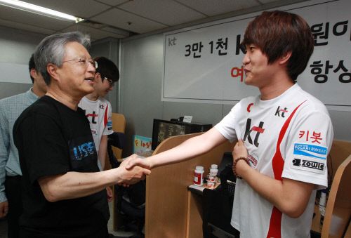 ... ▲KT 이석채 회장이 이영호에게 격려의 말을전했다. (사진제공=KT롤스터) KT롤스터 구단주인 KT 이석채 회장이 지난 15일 서울 서초구에 위치한 게임단 연습실을 방문해 선수들의 연습 모습을 지켜보고 우승을 위한 당부의 말을 전했다. 이 회장이 게임단을 방문한 것은 이