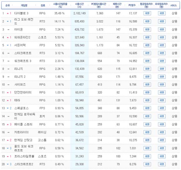 ... 블리자드가 국내에서 서비스하고 있는 두 RPG '디아블로3'와 '월드 오브 워크래프트'가 PC방 점유율에서 엇갈린 쌍곡선을 그리고 있어 눈길을 끈다. 게임전문 리서치 게임트릭스에 따르면 디아블로3의 긴급점검이 있었던 10일과 11일 월드 오브 워크래프트는 PC방 순위에서
