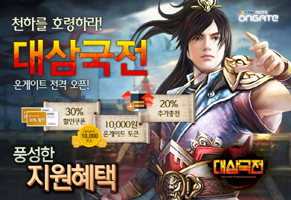 ...온게이트는 이번 '대삼국전' 채널링 서비스를 기념해 오직 온게이트에서만 즐길 수 있는 '풍성한 지원(支援)혜택' 이벤트를 진행한다. 먼저 온게이트를 통해 '대삼국전' 가입 시 아이템베이 1000원 마일리지를, 이용에 동의한 회원 전원에게는 '대삼국전' 초보자 패키지를 지급한다. 초