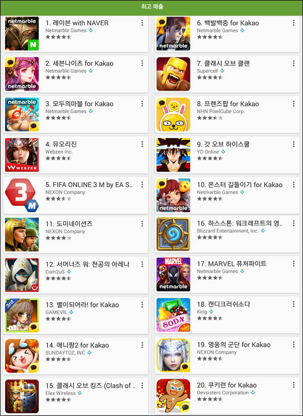 ... 더욱이 국내 최대 인프라를 자랑하는 카카오톡의 친숙한캐릭터를 활용한 만큼 빠르게 세대교체를 하고 있는 것. 이와 함께 넷마블게임즈의 모바일 FPS(1인칭슈팅) '백발백중 for Kakao'가 2위를 차지했다. '백발백중'은 현재 구글플레이 매출 11위, 애플 앱스토어