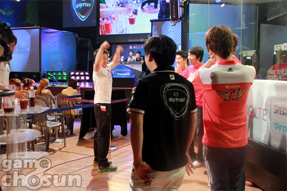 ... 패배한 팀에겐 코를 찌르는 '까나리 액젓 칵테일'이 벌칙으로 주어졌다. 이날 이벤트 경기는 각 팀 감독과 코치들이 힘을 합친 '코치팀'과 방송관계자들이 모인 '스태프팀'이 대결을 펼쳤다. 코치팀은 KT롤스터 이지훈 감독, IT뱅크레전드 임수라 감독, STX소울 조규백 코치,