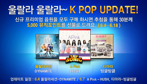 ... 먼저 4일 울랄라세션의 '다이너마이트(DYNAMITE)'가 추가됐으며, 7일 어 핑크(A PINK)의 '허쉬(HUSH)'와 티아라의 '빙글빙글'이 업데이트된다. 네오위즈인터넷은 업데이트를 기념해 오는 18일까지 기념 이벤트를 마련했다. 신곡을 프리미엄 뮤직으로 구매할