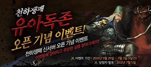 ... 옴니텔(대표 김경선)은 전략 시뮬레이션 웹게임 ‘천하쟁패’의 신규서버 ‘유아독존’ 오픈을 기념해, 다양한 이벤트를 진행한다고 30일 밝혔다. 이번 이벤트는 오는 7월 3일까지 신규 가입한 회원을 대상으로 아이패드와 문화상품권 등 푸짐한 경품을 증정하고, 참여한 50