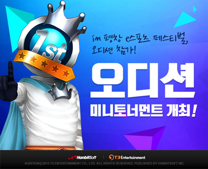 ... 오디션은 평창 e스포츠 페스티벌 기간 중인 12월 2일 오후 3시부터 저녁 7시까지 하이원 리조트 컨벤션 호텔에서 약 100여명의 참가자들을 대상으로 오디션 미니 토너먼트를 개최한다. 오디션 측은 순위권 안에 등극한 참가자들에게 등수 별로 100만원부터 30만원까지