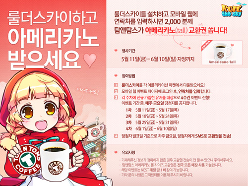 ...JCE(대표 송인수)는 스마트폰 소셜게임 '룰더스카이'에서 커피 전문브랜드 탐앤탐스(대표 김도균)와 제휴를 맺고 무료 커피 제공 이벤트를 실시한다고 22일 밝혔다. 이번 제휴 이벤트는 탐앤탐스가 실시하는 '5월의 로맨틱 프로포즈'의 일환으로 오는 6월 10일까지 진행된다.