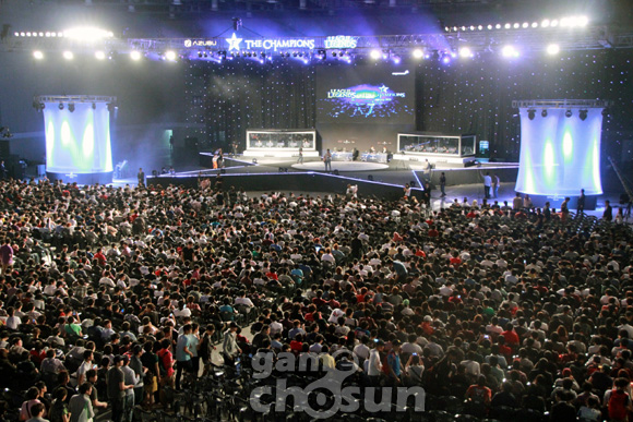 ... 19일 일산 킨텍스 제2전시장에서 리그오브레전드의 첫 정규 리그 '아주부 리그오브레전드 더 챔피언스 스프링 2012'의 결승전이 열리는 가운데, MiG 프로스트와 MiG 블레이즈의 대결을 보기 위해 현장을 찾은 관람객들이 준비된 5천 석을 가득 메우고 있다. [이시우 기자