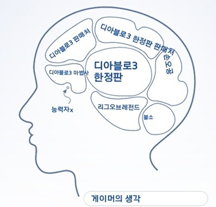 ...게이머의 뇌구조가 공개됐다. 최근 한 온라인 커뮤니티 게시판에는 ‘게이머의 뇌구조’라는 제목의 사진 한 장이 게재됐다. ▲게이머의 뇌구조 (출처: 온라인 커뮤니티) 공개된 사진 속에는 '디아블로3 한정판'이 머릿 속 한 가운데 크게 자리 잡고 있다