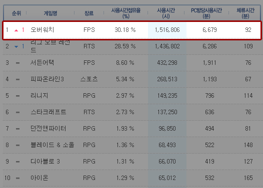 ...오버워치는 지난 18일 한 차례 1위를 달성하며 업계의 주목을 받았지만 이내 리그오브레전드에게 자리를 내주는 모습이었다. 하지만 사흘이 지난 22일 다시 정상에 오르는 기염을 토했다. '리그오브레전드'는 28
