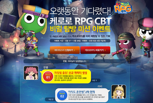 ...CJ E&M(대표 김성수) 온라인사업본부는 투니랜드에서 온라인 롤플레잉게임(RPG) '케로로RPG'의 비공개베타테스트(CBT)를 진행한다고 16일 밝혔다. 오는 20일까지 CBT를 진행하는 '케로로RPG'는 투니랜드가 개발 및 서비스 예정인 온라인 횡스크롤 RPG로,