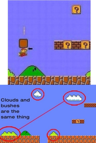 ... 최근 온라인 커뮤니티 게시판에는 '마리오 게임 하면서 몰랐던 사실'이란 제목으로 화면 속 구름과 풀의 모양이 똑같다는 것을 주장하는 사진 한장이 올라왔다. 단지 색깔만 다를 뿐 같은 모양의 디자인을 여러 곳에 이용했다는 것. 이 사진을 접한 네티즌들은 "누가 계속