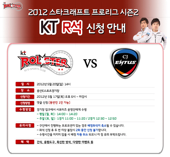 ... KT R석은 경기장을 찾는 팬들이 더욱 좋은 환경에서 경기를 관람할 수 있도록 돕기 위해 만든 제도로써, 팬들의 편의를 위한 방석과 햄버거, 피자 등의 간식, 그리고 응원도구를 지급하는 KT롤스터의 팬들을 대상으로 하는 프로모션이다. 이에 KT롤스터는 시즌2에도 R석 제도를