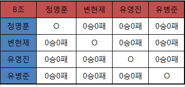 ... 조 지명과 추첨을 통해 이들을 B조로 몰아넣은 정명훈은 조 편성이 완료되자 웃음을 감추지 못했다. 하지만 나머지 세 선수도 모두 조 편성에 대해 만족감을 드러냈다. 정명훈을 제외한 나머지 둘이 상대적으로 약하기 때문에 다른 조에 비해 조 2위 자리를 노리기가 수월할 것이라고