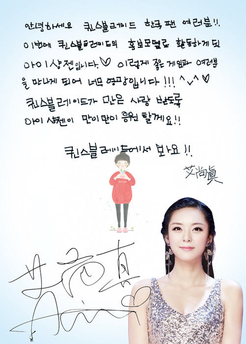 ... 아이샹젠이 직접 한글로 쓴 응원 메시지는 "퀸스블레이드가 많은 사랑 받도록 아이샹젠이 많이 응원할게요"라는 내용이다. 서툴지만 또박또박 쓴 글씨를 보고 유저들은 "한글로 쓴 정성이 느껴진다"며 호감을 표했다. 한편, 아이샹젠은 오는 14일 입국해 '퀸스블레이드'의 홍보