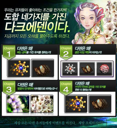 ...소프톤엔터테인먼트(대표 유태호)는 뱀파이어 MMORPG '다크에덴'에서 '4가지' 이벤트를 진행한다고 9일 밝혔다. 6월 5일까지 진행되는 '4가지' 이벤트는 KBS2TV '개그콘서트'의 인기 코너인 '네가지'를 활용해 총 4종 이벤트로 구성됐다. 회사측은 이번 이벤트를