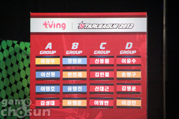 ...8일 용산 e스포츠 상설경기장에서 '티빙 스타리그 2012 16강 조 지명식'이 진행됐다. 지난 시즌 우승자인 허영무(삼성전자칸)을 비롯해 정명훈(SK텔레콤T1), 신동원(CJ엔투스), 어윤수(SK텔레콤T1)가 시드를 받아 각각 조 지명과 추첨을 행사했다. 허영무가 지명하고