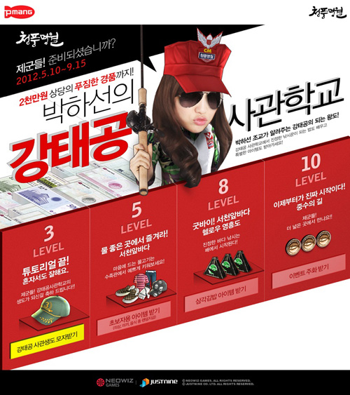 ... 해당 이벤트를 통해 이용자들은 3, 5, 8레벨을 달성할 때마다 '사관생도 모자'와 초보자 패키지, 체력 회복 음식 등 아이템을, 10레벨을 달성하면 게임머니 10,000골드를 각각 지급받는다. 초보자 패키지는 의상과 미끼 등 아이템으로 구성됐다. 네오위즈게임즈는 이