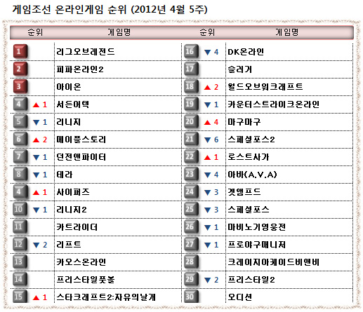 ... 웹보드 게임과 웹브라우징 게임은 제외된 리스트입니다. 4월 마지막 주에는 '디아블로3'와 '블레이드앤소울'의 경합이 시작돼 게이머들과 게임 업계 사람들 사이에 큰 이슈가 됐지만, 반면 기존 게임들의 인기 변화 폭은 잠잠한 편인 것으로 나타났습니다. 다소 순위가 오른