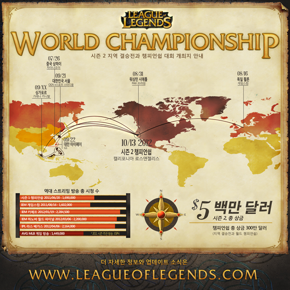 ... 월드챔피언십과 지역 본선의 총 상금은 e스포츠 사상 가장 큰 규모인 3백만 달러로, 시즌2의 전체 상금인 5백만 달러 중에서도 가장 큰 부분을 차지한다. 2011년 11월 리그오브레전드 시즌2 월드챔피언십이 시작된 이후 세계 최고의 리그오브레전드 팀들이 월드챔피언십에 참가하기