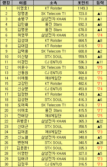 ... 이영호는 비록 프로리그 결승전에서 2패에 머물며 승점 추가에는 실패했지만, 정규시즌 개인 다승왕(15승)의 점수와 스타리그 듀얼을 통해 스타리그 본선 16강 진출에 성공하며 1,149. 3점으로 전달보다 소폭 점수를 상승시키며 1위를 유지했다. 그러나 랭킹 10위 이내