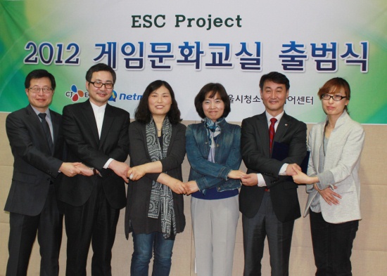 ... ▲성공적인 게임문화교실 ESC project를 위해 손을 맞잡고 결의하는 모습 (왼쪽부터 장근영 한국청소년정책연구원 연구위원, 서울시립청소년미디어센터 신순갑 관장, 학부모 대표 홍성아님, 학부모 대표 윤유광님, CJ E&M 넷마블 조영기 부문대표, 게임문화재단 김지