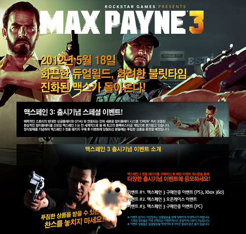 ...에이치투인터렉티브는 락스타게임즈가 개발하고 T2가 퍼블리싱하는 '맥스페인3'의 PS3, Xbox360 플랫폼 예약판매와 기념 이벤트를 18일부터 시작한다고 밝혔다. '맥스페인3' 정식 발매 기념 스페셜 이벤트는 정품 패키지 구매자를 대상으로 진행한다. 에이치투인터렉티브는 '