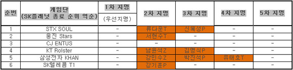 ... STX소울부터 스네이크 방식으로 진행된 이번 드래프트는 19명의 참가자 중 우선지명 없이 진행하여 총 9명의 선수가 게임단의 지명을 받았다. 종족별로는 저그 4명 중 2명, 테란 6명 중 3명, 프로토스 9명 중 4명의 선수가 지명되었으며, 삼성전자칸은 3명(저그 1, 테
