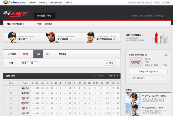 ... 넷마블 측은 "우선적으로 프로야구 개막과 함께 야구기록을 담은'KBO기록실'을 중심으로 사이트를 오픈했다"며 "향후 독점적인 콘텐츠를 더욱 보강해 5월 중 정식으로 오픈할 예정"이라고 설명했다. ▲ 마구스탯 사이트 향후 넷마블은 '마구스탯'에서 KBO 공식기록업체인