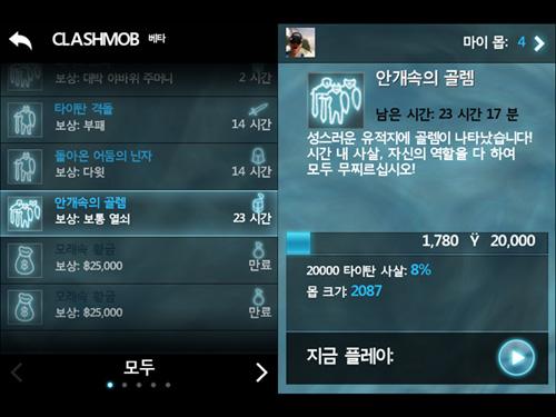 ... '클래시몹'은 플레이어의 진행상황을 페이스북이나 트위터에 올리면 온라인 친구들을 자신의 조직(몹)으로 규합시켜 특수한 버프나 업적, 보상을 받을 수 있도록 한 모드다. 이 모드에서는 등록된 친구의 수가 많을수록 좋은 특수 효과가 발동된다. 개발사 체어엔터테인먼트의 크리