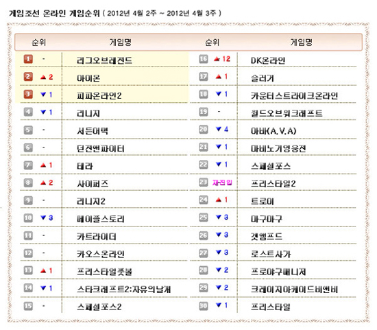 ...웹보드 게임과 웹브라우징 게임은 제외된 리스트입니다. 이번 주 게임조선 온라인게임 순위에서는 '리그오브레전드'가 6주 연속 1위를 차지하면서 최근 국내에 불고 있는 A0S 장르 게임의 인기를 실감케 했습니다. 반면 한 때 각종 게임 순위 차트에서 1위 자리를차지했던 아이온