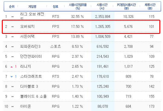 ...70%를 기록했으며, 첫 주말인 28일에는 16. 61%를 달성하는 등 가파른 상승세를 유지했다. '오버워치' 성과는 올해 출시된 PC온라인게임 중 높은 수치라는 점에서 고무적이다