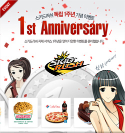 ... 이벤트 기간에만 통용되는 ‘독립 1주년 기념주화’를 모아 이벤트에 참여한 사용자에게는 보유 개수에 따라 피자, 케이크 그리고 도넛 등 다양한 상품을 증정한다. 또한, 기념주화 10개를 모은 모든 유저에게는 ‘독립 1주년 라이선스’를 특별 지급할 계획이다. '스키드러쉬'에
