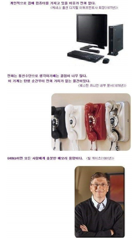 ... 게시물 속에는 과거 각 분야의 유명인과 전문가들이 당시 발명된 혁신적인 제품들에 대해 쓴 짧은 구절과 사진들이 담겨 있다. 특히 케네스 올센 디지털 아퀴프먼트사 회장이 1977년 남긴 망언이 눈길을 끈다. 당시 그는 “개인적으로 집에 컴퓨터를 가지고 있을 이