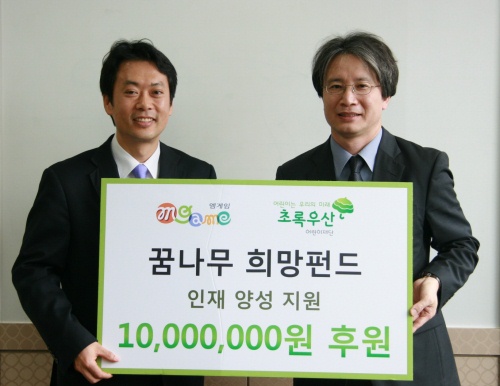 ...▲엠게임 권이형 대표이사(좌)와 어린이재단 이충로 본부장이 '2012 꿈나무 희망펀드 협약식' 후 포즈를 취하고 있다. '꿈나무 희망펀드'는 소외계층의 특별한 재능을 보유한 아동을 지원하는 임직원 사회공헌 프로그램으로, 올 한해 엠게임 임직원들의 자발적인 기부금과 회사의 후원금