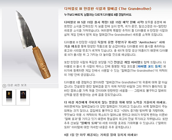 ... 디아블로3의 한정판 식칼의 가격은 40,001원이라는 다소 이색적인 가격에 책정 됐으며, 이 식칼을 구입 시 게임 내 전설의 아이템인 '할매검'을 함께 지급한다고 해 이용자들의 관심을 끌었다. 특히, '할매검'은 검임에도 불구하고 최고 +250% 증가된 방어력 옵션을 가지고