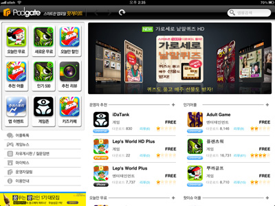 ... 먼저, '팟게이트'는 해상도가 2048*1536인 뉴아이패드에 맞춰 화면 디자인과 앱 구동 프로세스를 최적화했다. 또 초기화면에서 목록과 메뉴를 한 눈에 볼수 있게하고 메뉴 설명에 이미지를 추가해 가시성을 높였다. ▲ 뉴아이패드용 '팟게이트' 화면 또 '오늘만 무료'