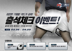 ...한빛소프트(대표 김기영)는 26일부터 온라인 축구 매니저 게임 'FC매니저'에서 출석체크 이벤트를 진행한다고 밝혔다. 오는 4월 29일까지 게임 내 접속하면 매일 마다 구단 지원금 또는 선수카드가 들어 있는 출석 선물 상자가 1개씩 지급된다. 월요일부터 일요일까지 일주일 동