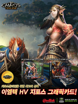 ...이번 그래픽카드 패키지는 '카오스온라인'의 인기 영웅 일러스트로 디자인됐으며, 게임 내에서 사용 가능한 9만원 상당의 쿠폰이 함께 제공된다. 쿠폰에 기재된 핀번호를 홈페이지에서 입력하면 '급속 성장의 물약' 6개월 사용권과 '풍요의 물약' 3개월 사용권, 게임머니 10만 GP를
