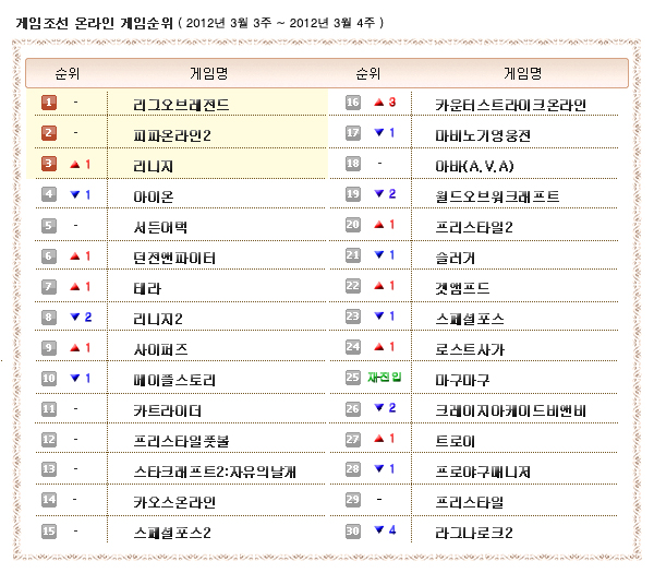 ... 이번 주 게임조선 온라인게임 순위는 지난 주와 동일하게 제자리를 지키고 있는 게임들과 1에서 2단계로 순위가 소폭 오르거나 낮아진 게임들이 주를 이루고 있습니다. 특히, 지난 2주간 같은 순위를 유지하며순위 상승의 기회만을 노리던 '리니지'와 '테라'가 상위권 내에서 한단계