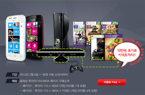 ... 먼저, 기본 패키지의 경우 루미아710과 XBOX360, 게임 타이틀 1종(포르자모터 스포츠3)로 이루어졌으며, 한 달에 17,416원씩 24개월 약정을 통해 418,000원의 가격으로 판매되고 있다. 키넥트가 추가된 패키지2는 루미아710과 XBOX360, 키넥트, 키넥