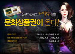 ... 이 이벤트는 신규 가입 후 40레벨 및 플레이타임 40시간 달성과 함께 명성 10포인트를 획득한 유저에게 100% 문화상품권 또는 해피머니 상품권을 증정한다. 또, 앞선 이벤트를 완료한 유저 중 오는 4월 6일까지 50레벨을 달성한 사람에게는 100% 스킬 초기화 스크롤을 지