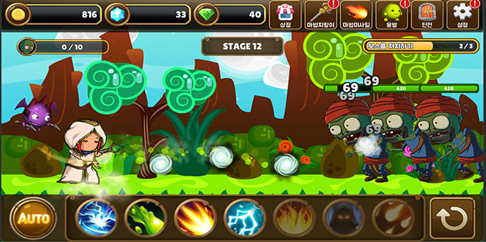 ... 제목에서 알 수 있듯이 먼저 마법사 캐릭터가 등장하고, 화면 반대쪽에서 좀비들이 러시해 옵니다. 화면을 터치하면 매직 미사일을 발사하여 쓰러뜨리죠. 좀비를 일정량 쓰러뜨리면 스테이지 보스가 등장하고, 이조차도 물리치면 유료 재화를 포함하여 다량의 보상을 얻을 수 있습니다